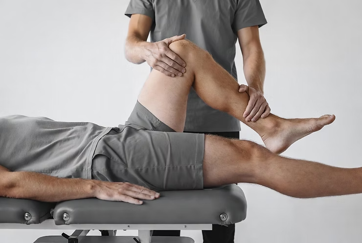 The patient lies supine with the painful leg positioned at the edge of the treatment table.